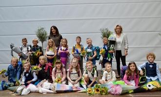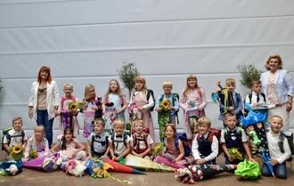 Klasse 1a mit Klassenlehrerin Frau Klaucke (li.) und Horterzieherin Frau Schlie (re.)