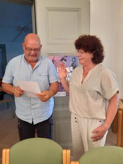 Uwe Müller (links) nimmt als scheidender Amtsvorsteher den Amtseid der neue Amtsvorsteherin Kathrin Wegener ab.