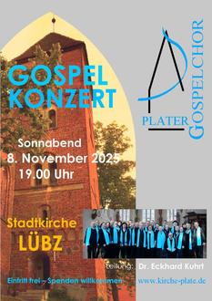Der „Plater Gospelchor“ unter der Leitung von Dr. Kuhrt (Gitarre, Keyboard und Gesang) ist zum 4. Mal wieder zum Konzert in der Stadtkirche in 19386 Lübz zu Gast.
