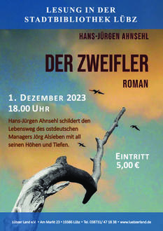 Am 01.12.2023 stellt Hans-Jürgen Ahnsehl seinen zweiten Roman „Der Zweifler“ in der Stadtbibliothek Lübz vor. Die Region Lübz, genau genommen die Lübzer Brauerei, spielt in diesem Buch eine besondere Rolle. Als ehemaliger Mitarbeiter der bundesweit bekannten Brauerei, in der Hans-Jürgen Ahnsehl 22 Jahre die kaufmännische Führung hatte, ist es ihm ein besonderes Anliegen in Lübz zu lesen.