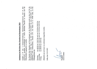 Der Bericht über Spenden und Zuwendungen an die Gemeinden sowie an das Amt für die Haushaltsperiode 2024 liegt in der Zeit vom 10.02.2025 bis zum 28.02.2025 im Amt Eldenburg Lübz, Rathausanbau, Zimmer 2-07, Am Markt 22 in 19386 Lübz, zu den Öffnungszeiten am