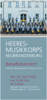Das Heeresmusikkorps Neubrandenburg wird am 28. April 2025 erstmals im Solitär des Landratsamtes L-P, Putlitzer Str. 25 in 19370 Parchim zu erleben sein. Um 19:00 Uhr gibt Orchesterleiter Christian Prchal den ersten Auftakt, um danach gewohnt charmant durch den bunten Abend zu führen. Neben zeremoniellen Märschen stehen Ouvertüren, brillante Solowerke und die ein oder andere musikalische Überraschung auf dem Programm.