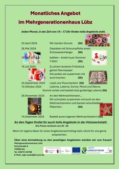 Einmal im Monat bieten wir ein Angebot an, zu dem alle herzlich eingeladen sind. Wir wollen backen, kochen und kreativ werden. Wenn Ihr Lust habt, meldet Euch vorher gerne bei uns im MGH an (Telefonnummer: 038731 20766 oder per Mail: mgh-luebz@jfv-pch.de).
