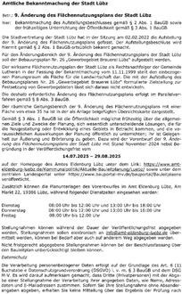 Die Stadtvertretung der Stadt Lübz hat in der Sitzung am 02.02.2022 die Aufstellung der 9. Änderung des Flächennutzungsplans gefasst. Der Aufstellungsbeschluss wird hiermit gemäß § 2 Abs. 1 BauGB ortsüblich bekannt gemacht.