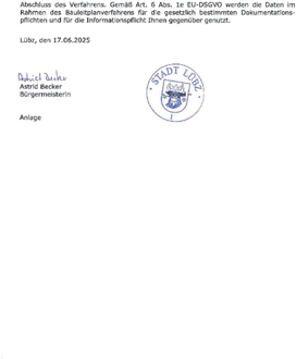 Die Verarbeitung personenbezogener Daten erfolgt auf der Grundlage des Art. 6 (1) Buchstabe e Datenschutzgrundverordnung (DSGVO) i. v. m. § 3 BauGB und dem DSG M-V. Es wird darauf aufmerksam gemacht, dass Dritte (Privatpersonen) mit der Abgabe einer Stellungnahme der Verarbeitung ihrer angegeben Daten, wie Name, Adressdaten und E-Mailadressen zustimmen. Sofern Sie Ihre Stellungnahme ohne Absenderangaben abgeben, erhalten Sie keine Mitteilung über das Ergebnis der Prüfung nach Abschluss des Verfahrens. Gemäß Art. 6 Abs. 1e EU-DSGVO werden die Daten im Rahmen des Bauleitplanverfahrens für die gesetzlich bestimmten Dokumentationspflichten und für die Informationspflicht Ihnen gegenüber genutzt.