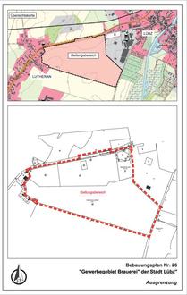 Der räumliche Geltungsbereich des Bebauungsplans umfasst eine Fläche von etwa 35 ha und ist dem als Anlage 1 beigefügten flurstücksbezogenen Lageplan zu entnehmen. Er erstreckt sich auf die Flurstücke 107/8, 118/10 (tlw.), 129/3 (tlw.), 129/4, 129/5 und 130/11 der Flur 1 in der Gemarkung Lutheran und bezieht darüber hinaus die Flurstücke 29 (tlw.), 30 (tlw.), 25/4, 25/5, 25/6, 25/7, 26/7, 27/1, 27/2 der Flur 19, Gemarkung Lübz ein.