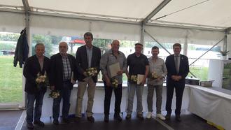 Für 20 Jahre kommunalpolitisches Engagement wurden ebenfalls ausgezeichnet (v.l.n.r.): Joachim Lübcke, Bernd Engelhard, Jens Kühl, Uwe Müller, Rainer Raeschke, Ulrich Lemke. Klaus-Michael Glaser vom Städte- und Gemeindetag Mecklenburg-Vorpommern übergab die Urkunden.