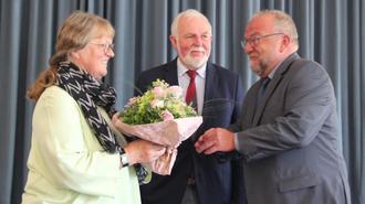 Ingrid und Peter-Wilhelm Jacobsen empfangen Blumen des Nachfolgers Micheal Eichhorn (re.)