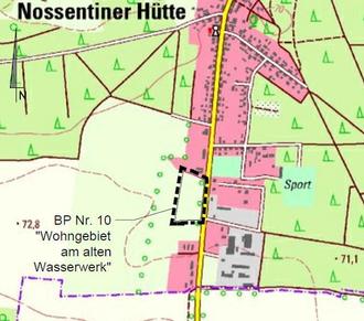 Der von der Gemeindevertretung Nossentiner Hütte in der Sitzung am 9. März 2023 gebilligte und zur Auslegung bestimmte Entwurf des Bebauungsplanes Nr. 10 mit der Bezeichnung „Wohngebiet am Alten Wasserwerk“ für den Bereich nördlich des ehemaligen Wasserwerks und westlich der Landesstraße L20 (siehe Lageplan), liegt in der Zeit