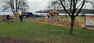 Derzeit werden für die Kleinkinder Wasserspiel, Kletterhaus und Schaukeln aufgebaut. Es folgen die Umkleidekabinen, der Grillplatz, die Sitzmöbel, das Spielgerät am Wasser und der Bademeisterturm. Da die Spielgeräte vorgefertigt wurden, ist die Aufstellung und Montage schnell zu realisieren.