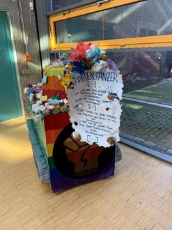 Das umfangreiche Angebot der Aktionswoche wurde durchweg positiv aufgenommen. Dies ließ sich vor allem während des World Cafés beobachten, bei dem Vertreter aus allen Bildungsgängen unserer Schule miteinander ins Gespräch kamen und engagiert über aktuelle Themen unserer Gesellschaft diskutierten. Hierzu zählte der Austausch über Diskriminierung, Gleichberechtigung und die Gestaltung einer besseren Zukunft. Im Zeichen gelebter Demokratie diskutierten hier angehende Einzelhandelskaufleute, Holztechniker, Fachgymnasiasten und Pfleger miteinander auf Augenhöhe. Ein weiterer Höhepunkt war ein ganztägiges Kunstprojekt, das durch zahlreiche Schülerinnen und Schüler aus eigener Initiative unterstützt wurde. Innerhalb eines Tages gelang die Fertigung einer Freiplastik, die einen Appell zum Frieden und die Betonung des Werts menschlichen Lebens verkörpert. Elaine-Joy Michalke, die als Schülerin des Fachgymnasiums an dem Kunstprojekt mitwirkte, resümierte: „Wir haben im Teamwork einen Friedenspanzer gebaut, der einen Widerspruch in sich darstellen soll und an den Song ‚Friedenspanzer‘ der Ärzte angelehnt ist. Mit diesem Kunstwerk wollen wir ein Statement setzen für Toleranz und außerdem muss man nicht alles mit Waffen oder Gewalt klären.“