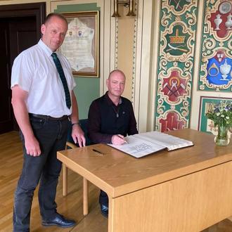 Steffen Bühring (re.) trug sich im Beisein von Bürgermeister Axel Müller zudem ins Ehrenbuch der Stadt Malchin ein.