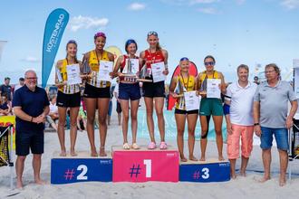 Große Freude über Platz 3 bei der Siegerehrung um die U19-Meisterschaft im Beachvolleyball beim Duo Dill/Zornow.