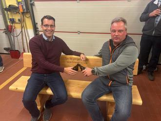 Bürgermeister unter sich: Stefan Vos (re./Bürgermeister von Recke) übergab Rico Zoschke die Jubuläumsbank.