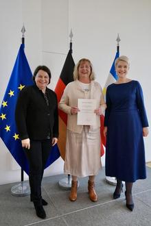 Manja Zoschke (Mitte) wurde von Ministerpräsidentin Manuela Schwesig (re.) sowie Stefanie Drese (Ministerin für Soziales, Gesundheit und Sport) ausgezeichnet.