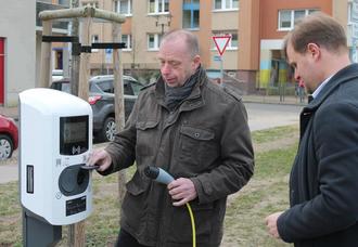 Bürgermeister Axel Müller testete gleich einmal die neuen Ladesäulen mit dem stadteigenen VW e-up.