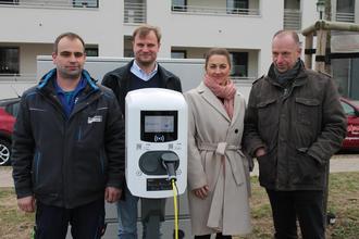 v.l.n.r.: Fritz Grotevendt, Dr. Fabian Sösemann mit Frau Kamila und Bürgermeister Axel Müller bei der Einweihung der E-Ladesäulen.
