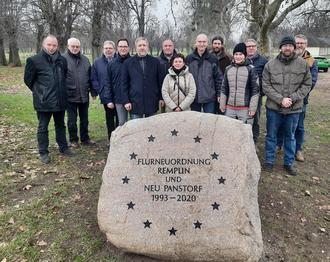 Das Bodenordnungsverfahren Remplin und Neu Panstorf wurde mit der Enthüllung des Gedenksteins an der B104 abgeschlossen und gewürdigt. Mit dabei waren auch Bürgermeister Axel Müller und Bauamtsmitarbeiterin Kerstin Raschke (Mitte).