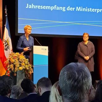 "Eine gute Kommunikation und Öffentlichkeitsarbeit ist ihr besonders wichtig. Frau Müller will die Arbeit hinter landwirtschaftlichen Produkten sichtbar machen und zeigen, dass Landwirtschaft mehr ist, als Trecker fahren und die engagierten Menschen zeigen, die mit großer Leidenschaft ihrem Beruf nachgehen. Das tut die Landwirtschaftsexpertin seit 2002 als Geschäftsführerin des Bauernverbandes Malchin und seit 2016 als Vizepräsidentin des Bauernverbandes MV. Darüber hinaus ist Frau Müller seit 10 Jahren Vorsitzende des Landfrauenverbandes, den sie vor über 30 Jahren mitgegründet hat", lobte die Ministerpräsidentin in ihrer Laudatio auf die Ordensträgerin.
