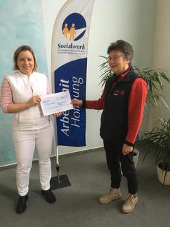 Frau Haberer (li.) von der Rats-Apotheke Malchin überreicht den symbolischen Spendencheck an Frau Dahms von der TAFEL Malchin