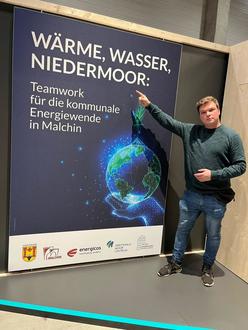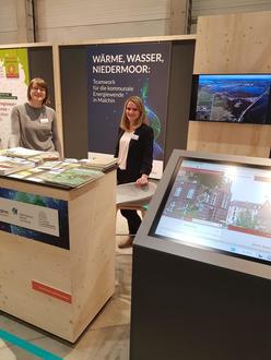 Zusammen mit den Akteuren der energicos GmbH (Thea Dymke), Greifswald Moor Centrum (Sophie Hirschelmann), dem WasserZweckVerband Malchin Stavenhagen (David Schacht und Uta Berghöfer) und der Agrotherm GmbH (Ludwig Bork) warben die Beiden am Stand "Wärme, Wasser, Niedermoor - Teamwork für die kommunale Energiewende in Malchin" im Campus ländlicher Räume. Auch ein ortskundiger Bürger aus Malchin machte sich auf den Weg in die Messehalle und informierte sich zu diesem Thema.