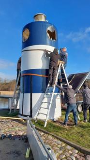Schon am nächsten Tag spazierten die ersten Leute zum Salemer Hafen, um den Leuchtturm zu bewundern. Bis zur Aufstellung wird aber noch etwas Zeit vergehen, müssen doch noch einige kleine Reparaturen erledigt werden. Und dann ist da noch die nötige Baugenehmigung zum Aufstellen des Turmes, um die sich unser Bürgermeister kümmert