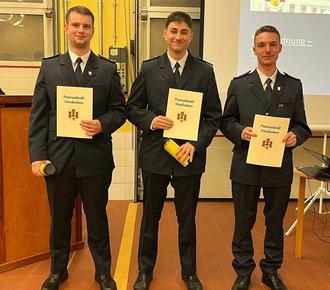 Lars Rotter, Dervis Kandemir, Hannes Berendt (v.l.) sind ab sofort Oberfeuerwehrmänner.