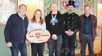 Greta Buhr (2.v.l.) heißt die Sportlerin des Jahres 2022. Die Kanutin konnte die Jury überzeugen. Ole Frank (Mitte), ebenfalls für den Malchiner Kanuclub aktiv, wurde als Nachwuchssportler des Jahres geehrt. Beide nahmen ihre Preise von Jury-Mitglied Rainer Jung (l.), Schornsteinfeger Philipp Niendorf (Sponsor) sowie Bürgermeister Axel Müller entgegen.