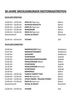 Nun feiern wir in diesem Jahr unser 30-jähriges Jubiläum sowie meinen Abschied von der großen Veranstalterbühne. Und natürlich liegt es mir am Herzen, dieses letzte Treffen zu nutzen, um unsere Jugend, den Nachwuchs aus unserer Heimat, mit einzubeziehen. Wie bereits in den Vorjahren, möchten wir parallel zum Mecklenburger Motorradtreffen einen Wettbewerb für junge Nachwuchsbands veranstalten, die sich dadurch nicht nur einem großen Publikum präsentieren, sondern auch Preise gewinnen können.