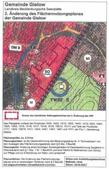 Die Gemeindevertretung der Gemeinde Gielow hat in der öffentlichen Gemeindevertretersitzung am 16.03.2023 die Vorentwurfsunterlagen der 3. Änderung zum Flächennutzungsplan der Gemeinde Gielow sowie die Begründung gebilligt und zur frühzeitigen Öffentlichkeitsbeteiligung nach § 3 Abs. 1 BauGB bestimmt.