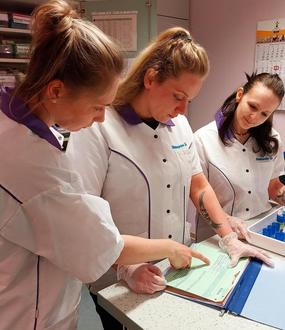 Es ging weiter durch die vielen Stationen des Pflegeheims. Als nächster Schwerpunkt hatte die Gesprächsrunde am Morgen die Medikamentenausgabe gewählt. Eine Aufgabe, die allerhöchste Konzentration erfordert. Aus einer Unmenge an Pillen und Präparaten gilt es, für jeden Bewohner diese individuell zusammen zustellen. Dabei ist es wichtig, trotz des oft stressigen Alltags oder unverhoffter Zwischenfälle den Fokus zu behalten und Fehler zu vermeiden.