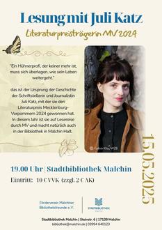 “Ein Hühnerprofi, der keiner mehr ist, muss sich überlegen, wie sein Leben weitergeht.” – Das ist der Ursprung der Geschichte der Schriftstellerin und Journalistin Juli Katz, mit der sie den Literaturpreis Mecklenburg-Vorpommern 2024 gewonnen hat. In diesem Jahr ist Juli Katz auf Lesereise durch MV und macht natürlich auch in der Bibliothek in Malchin Halt. Am 15. Mai ab 19 Uhr stellt sie uns in der Stadtbibliothek Malchin ihre ausgewählten, unterhaltsamen und klugen Texte vor. Wir freuen uns sehr und besonders auf eure Anmeldungen in der Stadtbibliothek, unter bibliothek@malchin.de oder 03994/640123. Der Eintritt kostet 10,- € im Vorverkauf, am Abend zzgl. 2,- €.