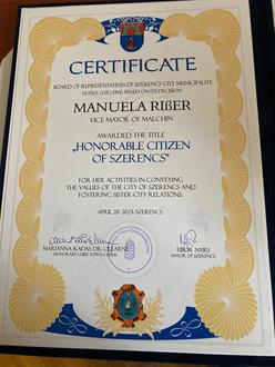 Sie wurde vom Bürgermeister, Tibor Nyiri, und Frau Dr. Zsofia Koncz, Abgeordnete des ungarischen Parlaments, für ihre Verdienst um die Städtepartnerschaft zur Ehrenbürgerin der Stadt Szerencs ernannt.