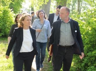Malchins Bügermeister und Verbandsvorsteher des WZV Malchin Stavenhagen im Gespräch mit der Bundesumweltministerin Steffi Lemke im Rempliner Schlosspark.
