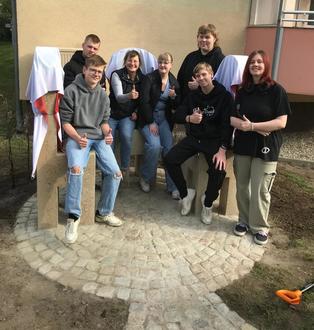 Unter Anleitung ihrer Lehrerin Frau Ruthenberg waren es 6 Schüler der Klasse 10 b, die hier drin einen sehr praktischen Teil ihres Religionsunterricht sahen und 19 Rotbuchen pflanzten. Diese sollen sich zu einer prächtige Hecke entwickeln und dem Erinnerungsort einen würdigen Rahmen geben. Einen Wunsch gaben sie mit auf dem Weg. Vielleicht können Bewohner der Strelitzer Straße bei großer Trockenheit etwas Wasser spenden.