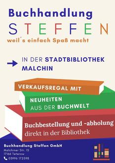 In Kooperation mit der Buchhandlung Steffen hat die Malchiner Stadtbibliothek ein Verkaufsregal mit einer Auswahl an Neuheiten und Bestsellern eingerichtet und auch Buchbestellungen für die Buchhandlung Steffen können bei uns abgegeben und später bezahlt und abgeholt werden.