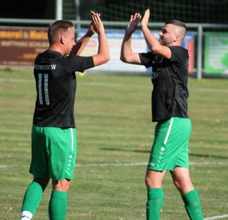 Andy Heuck (li.) und Ole Völker bejubeln hier eines der wenigen Treffer im Landespokal gegen Ribnitz-Damgarten.