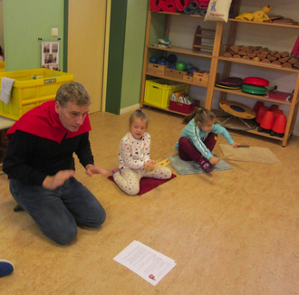 … so lautet eine Textzeile in dem wundervollen Lied vom gutherzigen Soldaten Martin, der seinen einzigen Mantel mit dem Schwert zerschnitt, um ihn mit einem Bettler, der in eisiger Kälte nur in Lumpen gekleidet vor dem Stadttor saß, die Bettelschale bittend hochhaltend, zu teilen. „Hülle dich darin ein, du armer Mensch“, sagte er und deckte ihn mit der Hälfte des Mantels behutsam zu. Im Laufe seines Lebens vollbrachte Martin noch viele weitere gute Taten an bedürftigen Menschen, und deshalb wurde er später sogar zum Bischof gewählt. Als Bischof von Tours ging der Heilige Sankt Martin in die Geschichte ein und jedes Jahr, am 11. November, erinnern wir an seine guten Taten. Damit diese nicht in Vergessenheit geraten, kam auch in diesem Jahr unser Kirchgemeindediakon Peter zu uns in die Kita und spielte diese besondere Szene vom Teilen des Mantels mit den Kindern nach. Mit ausgewählten Percussions begleiteten die Kinder das Spiel, und zum Abschluss teilten sie selber die am Vortag gebackenen Herzwaffeln mit ihrem Nachbarn. Ein herzliches Dankeschön gilt dir, lieber Peter, für deine wundervollen Ideen, den Kindern unsere Geschichte nahe zu bringen.