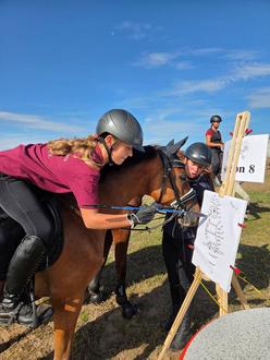 Viele fleißige Helfer hatten sich auf die zu bewältigenden 10 Stationen verteilt. Hier wurde das geballte Können von Ross und Reiter bei den unterschiedlichsten Aufgaben abgefragt. Es ging von Geschicklichkeitsparcours mit und ohne Pferde über Gegenstände ertasten bis zu Malen nach Zahlen und Lassowerfen. Für die Pferde hieß das vor allem die Ruhe bewahren, denn mit so vielen komischen Sachen wird das durchschnittliche Reitpferd ja nun auch nicht unbedingt jeden Tag konfrontiert. Die meisten bewältigten die Aufgaben jedoch souverän in kurzer Zeit.