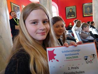 „Der ganze Tag ist richtig, richtig cool. Unser Workshop am Nachmittag besteht aus einer Stadtrallye durch die Greifswalder Altstadt mit verschiedenen Aufgaben, z. B. wie viele Treppen hat der Dom? Aber auch der Vormittag mit der Preisverleihung, den wir in dem Saal mit den goldverzierten Säulen verbringen, ist beeindruckend. Und natürlich unser zweiter Platz, ja, der ist eben beides: beeindruckend und cool.“