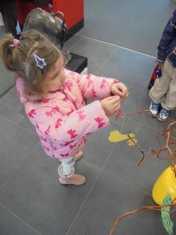 Mit gebasteltem Osterschmuck und einigen Frühlingsliedern im Gepäck, gingen wir heute in Richtung Sparkasse, um den vorbereiteten Osterstrauß ein wenig zu verschönern. Jedes der Kinder wollte wenigstens ein Teil aufhängen und es gab keine Not, denn gebastelt hatten wir ausreichend. An den Frühlingsliedern erfreuten sich nicht nur die Mitarbeiter der Sparkasse, auch den Kunden, die dort gerade zu tun hatten, zauberten wir mit unserem Besuch ein Lächeln ins Gesicht.