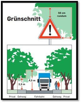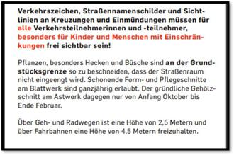 Seitlich wuchernde Hecken und überhängende Zweige und Äste an Geh- und Radwegen sowie Fahrbahnen können Fußgänger, Radfahrer und Fahrzeuge gefährden. Ebenso verhindert Überwuchs im Einmündungs- und Kreuzungsbereich oft die Sicht auf den Verkehr und führt vielfach zu Unfällen.
