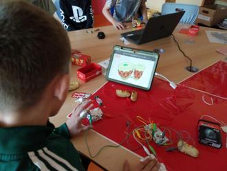 Für unsere einfallsreichen Köpfe geht es weiter. Teilnehmer Tamino nennt es „Irgendwas mit Strom!“ und das trifft es sehr gut. MaKey ist eine kleine Platine, mit dem sich leitfähige Objekte in Computertasten umwandeln lassen. Schnell und intuitiv können damit kreative, auf Berührungen reagierende Installationen hergestellt werden, z.B. Musikinstrumente, Computerspiele und vieles mehr!
