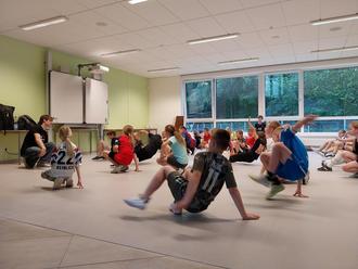 Statt wie geplant auf dem Sportplatz, verwandelte sich das Schulgebäude sowie die Turnhalle kurzerhand in eine bunte Bewegungsarena für alle Grundschul- und Vorschulkinder. An den sieben Stationen war für jede Altersgruppe etwas dabei: Von Goalball, Zweifelderball und Hockey über Breakdance, kleine Spiele, eine Turnreportage und ein Sportquiz.