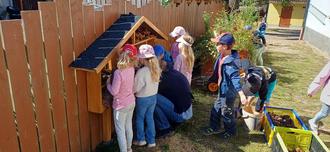 Das neue große Insektenhotel direkt neben dem Beet befüllten die Kinder mit verschieden Materialien. Wir hoffen, dass ganz viele Insekten ein schönes Zuhause in unserem Garten finden. An den selbstgebauten Insektentränken können die kleinen Krabbler ihren Durst stillen. Die Kinder halten ständig Ausschau nach allem, was bei uns herumkrabbelt, summt und brummt.