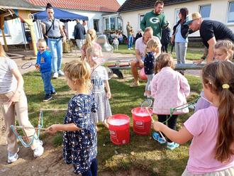 Nach einer gemeinsamen Eröffnung machten sich die Kinder an die einzelnen Stationen. Es wurden Schmetterlinge geangelt und Insektenkugeln landeten auf einem Apfelbaum. Als Schmetterlinge und Käfer geschminkte Kinder konnten in der Insektendisko tanzen oder den Insektenparcours ausprobieren. Die kulinarischen Genüsse kamen natürlich auch nicht zu kurz. Die kleinen Forscher und alle Gäste konnten sich mit leckerem Kuchen und Bratwurst stärken. Dann besserte sich das Wetter und die heiß ersehnte Hüpfburg wurde draußen aufgebaut. Glückliche Kinder hüpften durch die Gegend und schauten den schillernden Seifenblasen nach, die über die gesamten Außenanlagen schwebten.
