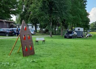 Ich wollte dann aber unbedingt zur Spielstraße um mit Claudia vom MSV Dahmen ein paar Spiele zu spielen. Ich versuchte auf Stelzen zu laufen und beim Kegeln auf der Straße alle Neune zu treffen. Dann aber musste ich weiter, denn Herr Sand mit seinen zwei Pferden war gekommen. Wie eine richtige Reiterin mit Helm durfte ich große Runden auf dem Pferd drehen.