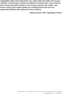 Tagesgästen wieder einen besonderen Tag. Leider wollte das Wetter nicht so ganz mitspielen und ließ einige Vorhaben buchstäblich ins Wasser fallen. Davon ließ sich aber niemand den Spaß verderben und so wurde kurzerhand das „Grillen" nach drinnen verlegt. Nach lustigen Spielen am Vormittag brachte dann der bunt angerichtete Grillteller allen wieder die Sonne ins Gemüt.