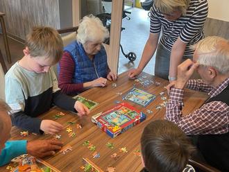 Zum monatlichen Besuch kamen auch wieder die Kinder der benachbarten Kita „Nordlichter" und brachten verschiedene Spiele mit. Getreu dem Motto „Jung und Alt verbindet" begegnen die Kinder den Seniorinnen ganz vorbehaltlos mit ihrer ehrlichen und offenen Art, sind neugierig und fordern zum Erzählen auf. Zusätzlich werden beispielsweise beim gemeinsamen Puzzeln oder „Mensch ärgere Dich nicht"- Spielen auch noch das Gedächtnis und die Feinmotorik ein wenig trainiert.