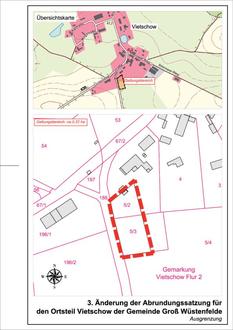 Die Gemeindevertretung der Gemeinde Groß Wüstenfelde hat am 21.05.2024 in öffentlicher Sitzung die 3. Änderung der Abrundungssatzung für den Ortsteil der Gemeinde Groß Wüstenfelde in der Fassung vom Mai 2024 als Satzung beschlossen.